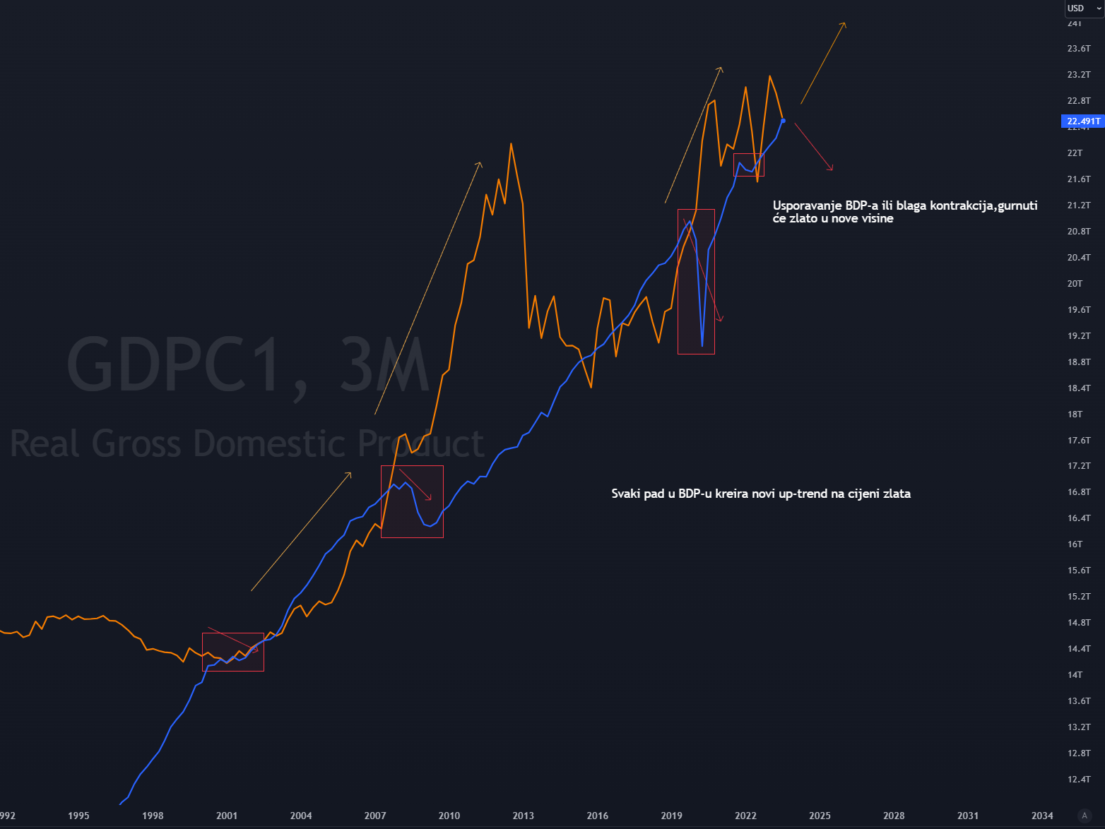 Pregled grafa iznad jasno ukazuje da je zlato gotovo svaki put kroz povijest krenulo u snažan uzlazni trend nakon što bi BDP počeo stagnirati ili usporavati(BDP plava linija – zlato zlatna). Unatoč najavama FED-a o “mekom slijetanju”, teško je očekivati da će se tržišta rebalansirati bez ozbiljnije recesije. Kada govorimo o recesiji, mislimo na tehničku recesiju koja će se očitovati kroz višemjesečno usporavanje BDP-a, a zatim i kroz stvarne gospodarske pokazatelje na terenu.