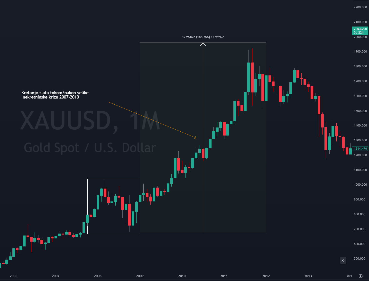Fokusirajući se na razdoblje od 2007. do 2010. godine, vidimo da je zlato postiglo svoj najviši vrhunac (ATH) te je s lakoćom zadržalo trgovinu iznad tog nivoa. Financijska kriza koja je kulminirala 2008. godine značajno je potresla svjetska tržišta, a zlato se dokazalo kao izuzetno pouzdan “safe haven” zbog prevladavajuće nesigurnosti. Iako su se tržišta oporavila zahvaljujući programima kvantitativnog popuštanja FED-a i drugim stimulacijama, vrijednosti zlata nikada nisu dosegle predrecesijske razine.